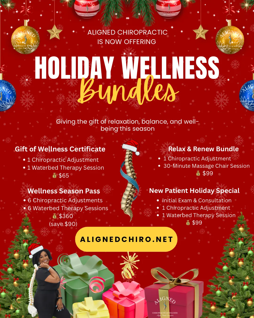 This season, give yourself (or someone you love!) the gift of relaxation, healing, and alignment. Our limited-time holiday packages are officially LIVE at Aligned Chiropractic & Wellness!